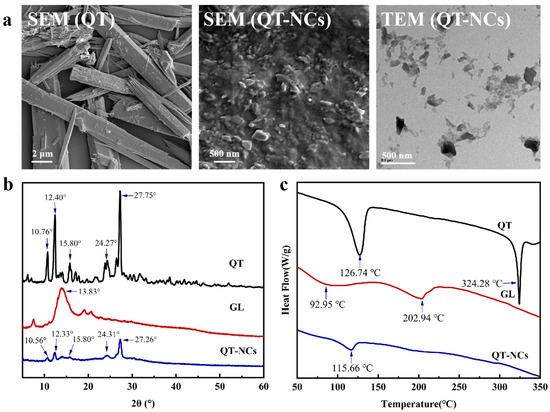 (a) SEM images at 5000× magnification of QT and 2000× magnification of QT-NCs and TEM photograph of QT-NCs. (b) XRD pattern and (c) DSC curve of QT, GL, and QT-NCs.