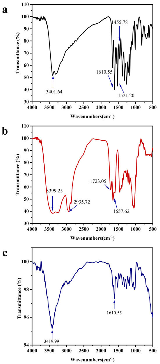 FTIR spectra of (a) QT, (b) GL, and (c) QT-NCs.