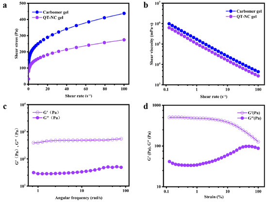 The dynamic rheological properties of the QT-NC gel are shown in Figure 5c,d. Throughout the measured frequency range, the G′ of the QT-NC gel remains consistently higher than G″, correlating with the increasing scanning frequency. The gel’s elasticity was evaluated using the frequency sweep method. In Figure 5d, rheological testing demonstrated the mechanical properties of the QT-NC gel, exhibiting gel-like and elastic behavior (G′ > G″) [40]. Notably, as the scanning frequency increases, there is little change in G′ and G″, indicating that the sample maintains its elasticity and stability [19]. These findings suggest that the gel can effectively diffuse and maintain its structure without phase separation, making it suitable for skin applications.