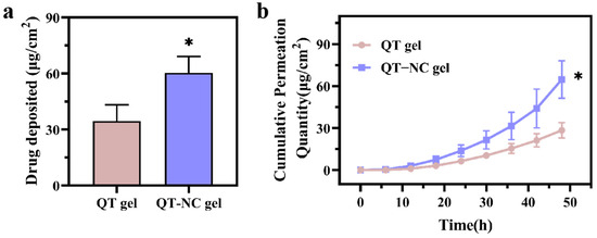 Ex vivo permeation (a) and QT deposition (b) of QT gel and QT-NC gel. n = 3; * p < 0.05.