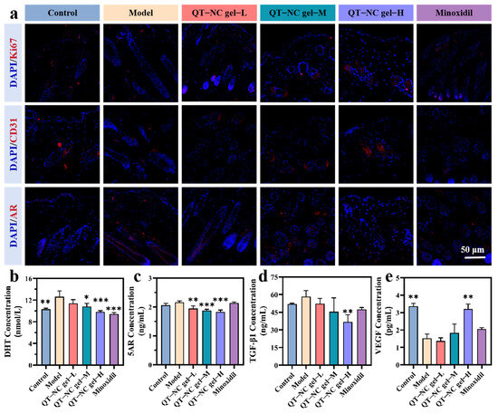 The study identified elevated DHT and 5AR levels and AR overexpression as two primary pathogenic factors in AGA. Consequently, cutaneous DHT and 5AR concentrations were quantified alongside follicular AR expression analysis (Figure 8b,c). A dose-dependent reduction in both DHT and 5AR content was observed, whereas minoxidil only demonstrated significant DHT suppression. These findings showed complete concordance with the immunofluorescence results presented in Figure 8a. Furthermore, TGF-β1 (Figure 8d), a negative regulator of hair growth, was also reduced in the skin tissue of the treatment groups to varying extents, with the high-dose group showing a significant decrease compared to the model group. VEGF shows strong angiogenic activity and affects the development of microvessels in HFs [44]. As shown in Figure 8e, VEGF expression in the skin treated with the high-dose gel was significantly increased compared to the model group, consistent with the CD31 immunofluorescence staining results, further confirming that the high-dose QT-NC gel has pro-angiogenic activity.