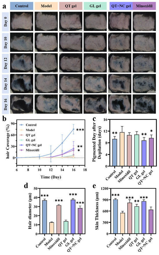 (a) Representative images of skin changes over 16 days (n = 6). (b) Hair coverage on days 0, 10, 12, 14, and 16 (n = 6). (c) Melanin deposition over time (n = 6). (d) Hair diameter (n = 6). (e) Skin thickness measurement (n = 3). * p < 0.05; ** p < 0.01; *** p < 0.001.