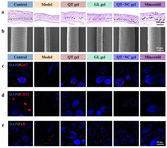 SEM images of newly grown hair (Figure 10b) revealed that the regenerated hair diameter in the model group was smaller, whereas the diameter in the treatment groups increased to varying extents. The results indicated that the hair diameter in the QT-NC gel group on day 16 was significantly larger than that in the model group (Figure 9d) and comparable to that in the minoxidil group, with no significant difference in the hair cuticle length. These findings further demonstrate that both QT gel and GL gel can promote the transition of skin from the telogen phase to the anagen phase. When used together, their effects are comparable to those of minoxidil and, in some aspects, even slightly superior.