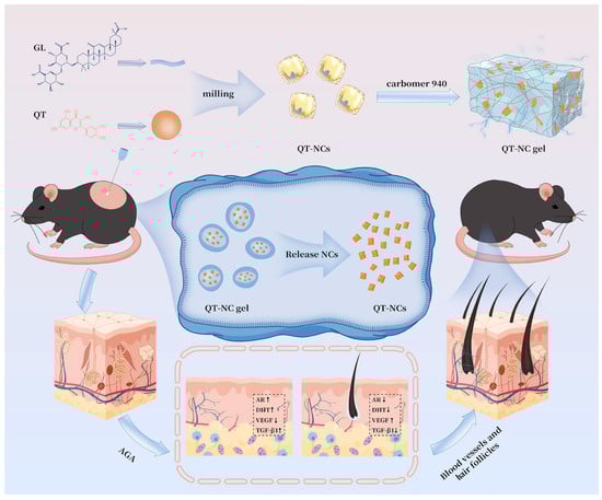 This study successfully developed a QT-NC gel formulation suitable for topical application and evaluated its therapeutic potential for AGA. QT was co-processed with GL using a top–down wet milling strategy to produce nanocrystals, which significantly enhanced dermal permeability and skin retention compared to native QT. Topical administration of the QT-NC gel elicited pronounced anti-androgenic and pro-regenerative effects in a DHT-induced AGA mouse model. Notably, QT and GL exhibited synergistic bioactivity, effectively promoting hair regrowth. These findings suggest that the QT-NC gel could serve as a promising therapeutic option for AGA and offer valuable insights into the rational design of anti-alopecia drug formulations. Future studies should prioritize further investigation into the follicular targeting efficiency and cutaneous interaction mechanisms of QT-NCs. Concurrently, while deepening the understanding of their pharmacological actions, early-phase clinical trials with limited sample sizes should be initiated to preliminarily evaluate translational potential.