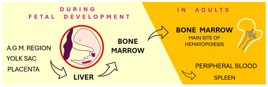Schematic depiction of the human hematopoietic stem cell maturation pathway [16,17,18]. During fetal development blood stem cells appear in the Aorta-Gonad-Mesonephros (AGM) region, the yolk sac and placenta. These are the early sites where hematopoiesis begins. Later in the development process, the fetal liver becomes the main site where red blood cells form. Towards end of gestation, the bone marrow takes over the primary site for red blood cell formation. In adults, the bone marrow is the main location where hematopoietic stem cells produce all types of blood cells. The mature red blood cells enter the peripheral blood to circulate throughout the body. The spleen also contributes by filtering blood and supporting blood cell development.