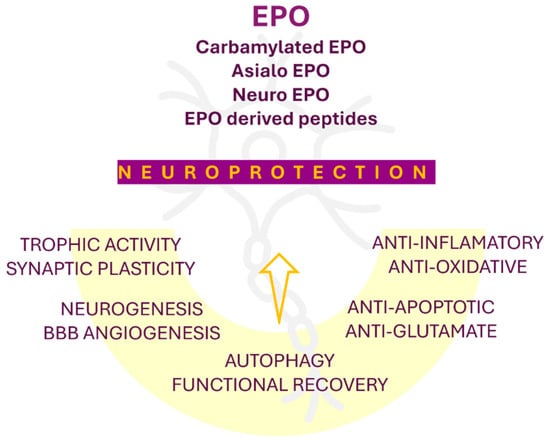Graphic representation of the neuroprotective effect of EPO, EPO derivatives or alternative molecules [51,52,53]. Biological effects of EPO and its derivatives, highlighting their neuroprotective, regenerative roles including: promotion of synaptic plasticity, neurogenesis, angiogenesis, autophagy, functional recovery, as well as anti-inflammatory, anti-oxidative, anti-apoptotic and anti-glutamate actions.