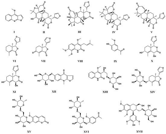 The 70% ethanol extract of DC was fractionated using macroporous resin to obtain fractions with different polarities. Further separation and purification by semi-preparative HPLC led to the isolation of seventeen compounds. Their structures were identified by NMR and ESI-MS. The seventeen compounds were as dictamnine (I) [48,49], evodol (II) [50], jangomolide (III) [51], limonin (IV) [48], obacunone (V) [52], fraxinellone (VI) [48], fraxinellonone (VII) [52,53], preskimmianine (VIII) [50,54], acetovanillone (IX) [55], isodictamdiol C (X) [56], dictamdiol B (XI) [57], dictamalkoside A (XII) [58], 3-[1β-hydroxy-2-(β-D-glucopyranosyloxy)-ethyl)-4-methoxy2(1H)-quinolinone (XIII) [59], 9α-hydroxyfraxinellone-9-O-β-D-glucoside (XIV) [57], haploperoside A (XV) [60,61], 4-hydroxy-3-methoxy-acetophenone-4-O-α-L-rhamnopyranosyl-(1→6)-β-D-glucopyranoside (XVI) [62], (+)-lyoniresinol-3α-O-β-D-glucopyranoside (XVII) [63]. Structural details are provided in Figure 1, and nuclear magnetic resonance spectra are provided in Supplementary Figures S1–S34.