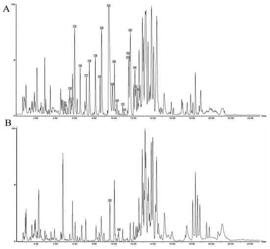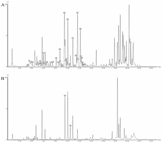 UPLC-Q-TOF-MS BPI chromatogram of DC extracted thick paste. (A) Positive ion mode; (B) Negative ion mode.