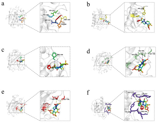 Target protein structures were acquired from RCSB PDB (https://www.rcsb.org/, accessed 20 June 2025) [44]. 2D molecular structures were retrieved from PubChem, followed by energy optimization in Chem3D, while PyMOL (version 3.1.0) was used for protein preprocessing, including dehydration and ligand removal. Default parameters were applied for all subsequent steps. Protein and ligand preparations were conducted with AutoDockTools (version 1.5.7), followed by active site-centered grid generation. Molecular docking was executed using AutoDock Vina [45], with subsequent visualization of binding poses in PyMOL (version 3.1.0).