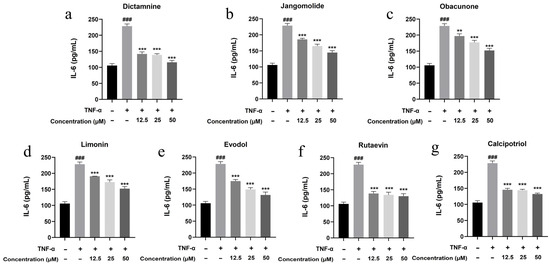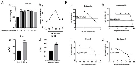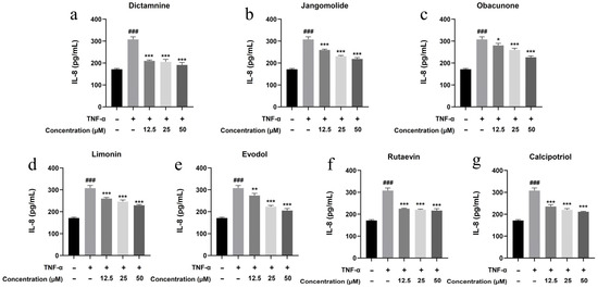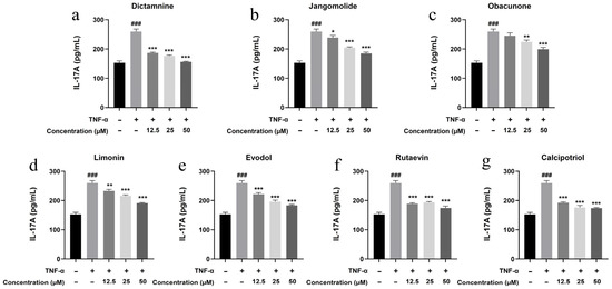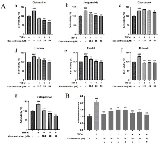For experimental procedures, 96-well plates were inoculated with HaCaT cells at a density of 1 × 104 cells per well. Following a 24 h incubation period, complete cellular adhesion was achieved prior to subsequent treatment. Experimental groups included: (1) untreated control (cells only); (2) TNF-α model group (30 ng/mL TNF-α alone); (3) test compound groups (30 ng/mL TNF-α + test compounds at final concentrations of 12.5, 25, and 50 μM); and (4) cell-free blank group. CCK-8 viability assessment was performed after 24 h of co-treatment. The inhibitory effects of test compounds on TNF-α-induced cell proliferation were evaluated based on cell viability data.
