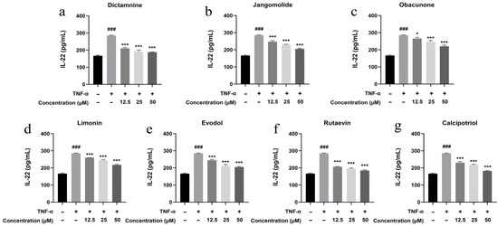 According to the experimental grouping described in Section 2.6.3, HaCaT keratinocytes were plated in 6-well culture dishes (1 × 106 cells/well). Conditioned media were harvested from TNF-α-activated cultures following compound treatment for subsequent cytokine quantification. Concentrations of interleukin IL-17A, IL-22, IL-1β, IL-6, and IL-8 were determined using commercial ELISA kits following the supplier’s protocols.