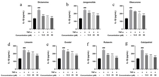 HaCaT keratinocytes were plated in 6-well culture dishes (3 × 105 cells/well) and exposed to TNF-α (30 ng/mL) or vehicle control for 24 h. Culture supernatants were subsequently harvested for quantification of IL-1β and IL-6 secretion using manufacturer-specified protocols. Additional experimental conditions employed TNF-α at concentrations up to 30 ng/mL as the highest treatment dose.
