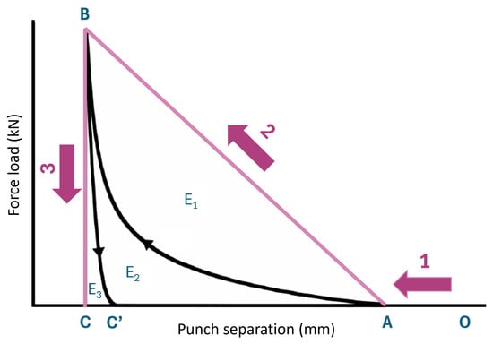 The energy parameters of the APIs were established following the methodology proposed by [21], which relies on calculating the area under the force-displacement curve (Figure 1). As illustrated in the figure, the compression process can be divided into three distinct phases: (1) particle rearrangement, (2) compaction, and (3) decompression. However, the idealized force-displacement curve depicted in the colored triangle in the figure does not reflect reality. In practice, energy losses occur during both the compaction (E1) and decompression (E3) phases, which are attributed to friction and elastic recovery, respectively. By computing the area under the curve (AUC) for the individual phases, the energy associated with each phase was calculated, providing insights into the elastic and plastic characteristics of the material. In this study, AUCs were calculated using numpy.gradient in Python [22] from temporal data of punch separation and force loading during compaction and decompression. Table 2 presents an overview of the energy parameters calculated and how they were computed.
