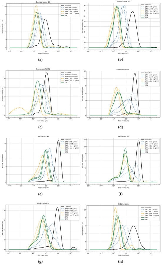 Particle size distributions of the jet mill experiments of (a) Domperidone OG, (b) Domperidone H1, (c) Ketoconazole OG, (d) Ketoconazole H1, (e) Metformin H1, (f) Metformin H2, (g) Metformin H3, and (h) Indometacin. For each API, the unmilled fraction and the fractions milled at different process settings are shown. CP represents the center point experiment.