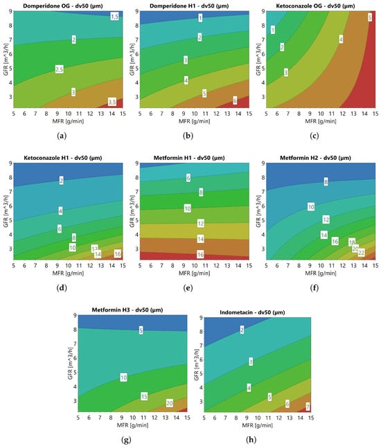 Contour plots of the dv50 response after jet milling of (a) Domperidone OG, (b) Domperidone H1, (c) Ketoconazole OG, (d) Ketoconazole H1, (e) Metformin H1, (f) Metformin H2, (g) Metformin H3, and (h) Indometacin. The contour plots were constructed based on the model, including both GFR and MFR.