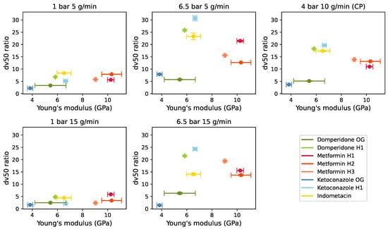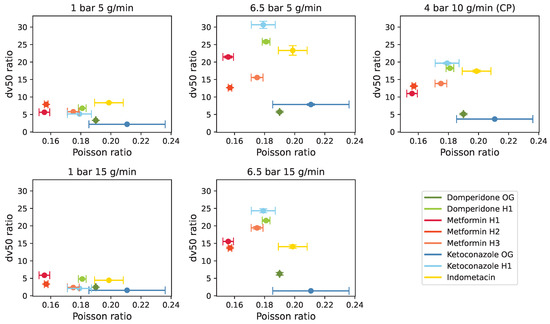 Correlation plots were constructed to investigate relationships between the in-die material properties and milling performance, depicted as the ratio of unmilled to milled dv50 values. Figure 5 and Figure 6 revealed subtle trends between milling performance and material properties, suggesting higher milling performance at higher Young’s modulus and lower Poisson ratio, aligning with theoretical expectations [31]. Nonetheless, these trends are not definitive and should be interpreted with caution.