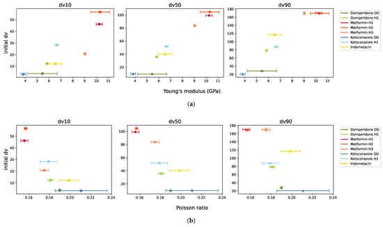 Young’s modulus and Poisson ratio seemed to be confounded with the initial particle size, as depicted in Figure 7. Young’s modulus was roughly proportional to particle size, while Poisson ratio was inversely proportional, consistent with the literature findings [32,33]. The obtained PSDs were measured from the particles exiting the mill, with the classifier ensuring that only particles below a certain size left the milling chamber. Consequently, larger initial particles were reduced more in size, resulting in a higher ratio of unmilled to milled dv values.
