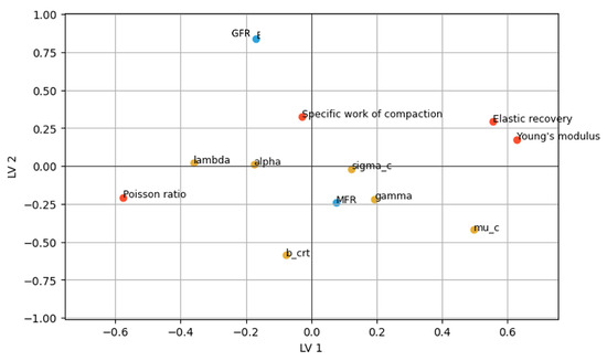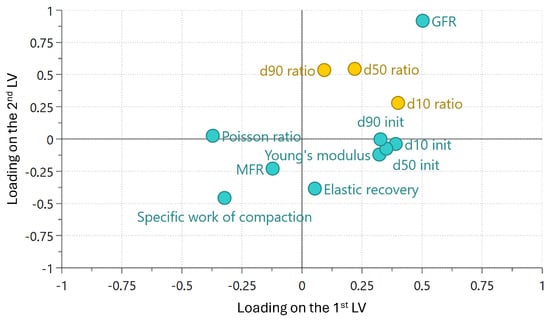 The score plots (Figure A3, Appendix A.5) revealed that PC1 was primarily driven by material properties, while PC2 was dominated by process settings. Consistent with the MLR results, the loading plot (Figure 8) indicated that GFR had a stronger influence than MFR, which was further reinforced by the variable importance plot (Figure A4, Appendix A.5). Furthermore, the loading plot also confirmed the confounding of initial particle size with Young’s modulus and, more indirectly, with Poisson ratio.