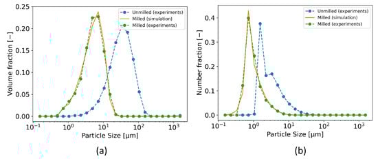 PBM successfully captured both volume-based and number-based PSDs. All of the calibration results are summarized in Table A2 in the Appendix A.4. Calibration was successful for most cases as the majority of the milled products exhibited monomodal PSDs (Figure 3). As an example, Figure 9 shows the PBM calibration results for Domperidone H1 at 2.2 m3/h of GFR and 5 g/min of MFR. Some experiments that yielded high objective function values, e.g., Metformin H1 at 2.2 m3/h of GFR and 15 g/min of MFR, corresponded to products with broader distributions (see Figure 3). The lower calibration performance in these cases can be attributed to the simplification of the breakage distribution function. While the original function in [11,12] can capture bimodal distributions more accurately, its larger number of parameters decreased identifiability. A more flexible breakage distribution function may therefore be required to achieve accurate simulation across different APIs and process conditions.