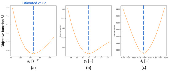 The identifiability analysis was performed to confirm the reliability of the parameter estimation results. In this study, the concept of [11,28] was used for the identifiability analysis, where the impact of varying the value of one parameter on the objective function was assessed. In the case of , the function is calculated as follows: