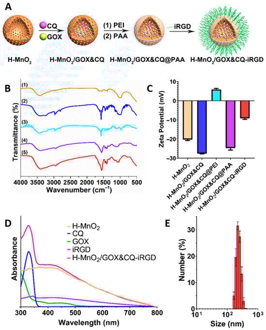 Construction and physicochemical characterization of H-MnO2/GOX&CQ-iRGD. (A) Stepwise synthetic route: silica templating → PEI-mediated MnO2 shell formation → core removal → sequential loading of GOX and CQ → PEI and PAA surface coatings → iRGD conjugation. (B) FTIR spectra of intermediates: (1) H-MnO2, (2) H-MnO2/GOX&CQ, (3) H-MnO2/GOX&CQ@PEI, (4) H-MnO2/GOX&CQ@PAA, and (5) H-MnO2/GOX&CQ-iRGD. (C) Zeta potentials of samples 1–5, illustrating surface charge shifts following each modification step. (D) UV–Vis absorption spectra of H-MnO2 (5 mg mL−1), CQ (500 μg mL−1), GOX (750 μg mL−1), iRGD (1 mg mL−1), and the final H-MnO2/GOX&CQ-iRGD, showing characteristic peaks at 329 nm (CQ) and 445 nm (GOX). (E) Hydrodynamic diameter distribution of H-MnO2/GOX&CQ-iRGD measured by DLS, centered at ~200 nm with narrow polydispersity.