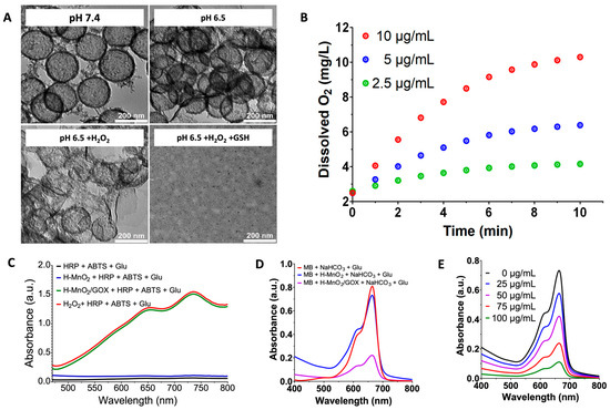 To investigate the TME-responsiveness of the system, we simulated the pancreatic TME (pH 6.5, ~100 μM H2O2, ~5 mM GSH) [39,40,41] and monitored degradation and drug release behavior. H-MnO2/GOX&CQ-iRGD remained stable at pH 7.4, the high structural stability of H-MnO2/GOX&CQ-iRGD under physiological conditions minimizes damage to normal tissues/organs during blood circulation. Slight degradation occurred under mildly acidic conditions (pH 6.5), while complete collapse of the MnO2 shell was observed in the presence of both H2O2 and GSH at pH 6.5, mimicking pancreatic TME conditions (Figure 2A).