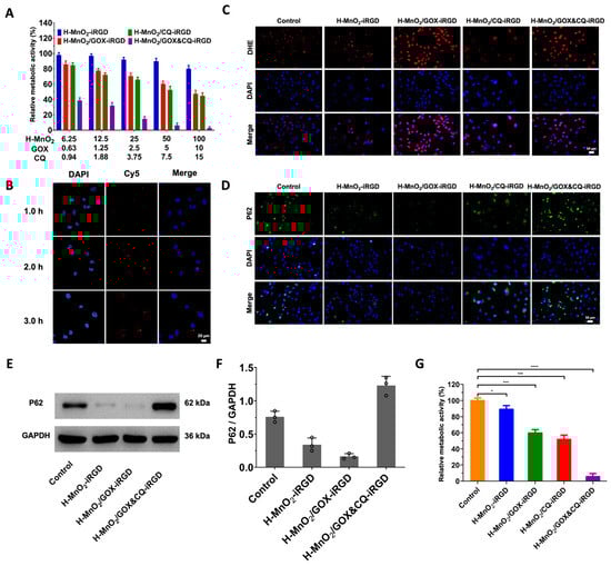 Cellular-level evaluation of H-MnO2/GOX&CQ-iRGD in PANC-1 cells. (A) Relative metabolic activity of PANC-1 cells after 24 h treatment with H-MnO2-iRGD, H-MnO2/GOX-iRGD, H-MnO2/CQ-iRGD, and H-MnO2/GOX&CQ-iRGD. (Concentration unit: μg/mL). (B) Confocal fluorescence images of Cy5-labeled H-MnO2/GOX&CQ-iRGD uptake at 1, 2, and 3 h (DAPI = blue nuclei; Cy5 = red) (scale bar: 20 μm). (C) Intracellular ROS detection by DHE staining under different treatments (λem = 610 nm). (D) P62 immunofluorescence for autophagy inhibition following treatment; increased P62 puncta indicate blocked autophagic flux (scale bar: 50 μm). (E,F) WB analysis of P62 accumulation in PANC-1 cells. (G) Comparative metabolism showing synergistic cytotoxicity of the dual-functional nanoplatform. Statistical significance: * p < 0.05; *** p < 0.001; **** p < 0.0001.