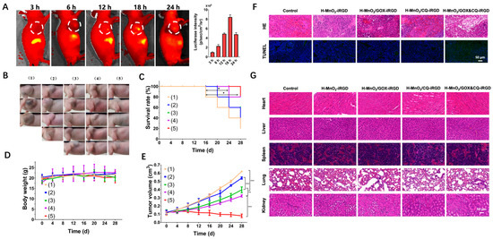 In vivo targeting and therapeutic efficacy of H-MnO2/GOX&CQ-iRGD in a pancreatic cancer mouse model. (A) Fluorescence imaging and quantitative ROI analysis of Cy7-labeled H-MnO2/GOX&CQ-iRGD showing tumor accumulation over 24 h (n = 3). (B) Representative images of tumor-bearing mice after 20 days of treatment. (C) Kaplan–Meier survival curves for each group. (D,E) Body weight (D) and tumor volume (E) changes during the 28-day treatment. Tumor volumes were analyzed by two-way ANOVA with Tukey’s post hoc test; survival was analyzed using the log-rank (Gehan–Breslow–Wilcoxon) test. Statistical significance: * p < 0.05, ** p < 0.01, *** p < 0.001. Treatment groups: (1) Control, (2) H-MnO2-iRGD, (3) H-MnO2/GOX-iRGD, (4) H-MnO2/CQ-iRGD, and (5) H-MnO2/GOX&CQ-iRGD. (F) H&E and TUNEL staining of tumor sections showing extensive necrosis and apoptosis in the dual-loaded group compared to limited effects in control and single-agent groups. (G) H&E staining of major organs showing no signs of systemic toxicity.