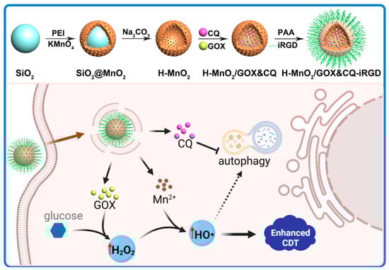 Herein, we designed a cascade nanoamplifier-targeting pancreatic cancer to enhance the therapeutic efficacy of CDT. This multifunctional nanoamplifier, termed H-MnO2/GOX&CQ-iRGD, integrates four synergistic components (Scheme 1). First, hollow manganese dioxide (H-MnO2) degrades in the acidic TME, releasing Mn2+ and O2, which generate cytotoxic ∙OH and alleviate hypoxia, while also depleting intracellular GSH, thereby weakening the tumor’s antioxidant defense system [18,19,20]. Second, GOX catalyzes the oxidation of glucose to produce H2O2, further amplifying ∙OH production and enhancing Fenton-like reactions. Specifically, MnO2 decomposes in the acidic tumor microenvironment to generate Mn2+ ions, which catalyze the conversion of endogenous H2O2 into highly reactive ∙OH via a Fenton-like reaction. These radicals cause oxidative damage to cellular components, leading to apoptosis or necrosis. This mechanism underlies the core of CDT and is further enhanced in our system by GOX-mediated self-supply of H2O2 [21,22,23]. Third, CQ acts as an autophagy inhibitor by accumulating in acidic organelles such as lysosomes, where it disrupts acidification and blocks autophagosome–lysosome fusion, thereby inhibiting autophagic flux. This enhances oxidative stress, sensitizes tumor cells to oxidative damage, and helps prevent the development of therapeutic resistance [24,25,26,27]. To overcome the dense stromal barrier in pancreatic cancer, we functionalized the nanoparticle surface with iRGD, a tumor-penetrating peptide that targets integrin αvβ3—overexpressed on both pancreatic cancer cells and tumor vasculature—thereby promoting deep tumor penetration [28,29,30,31,32].