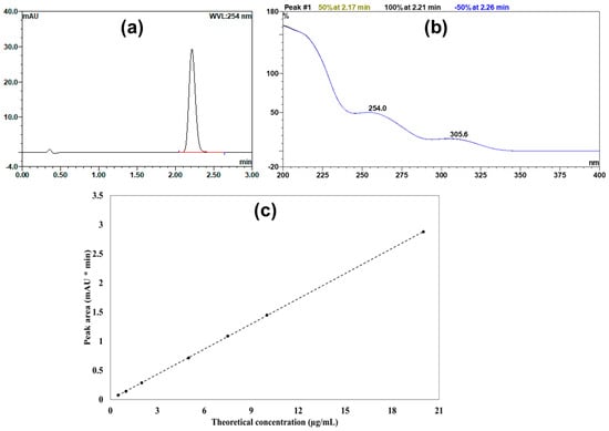 The developed UPLC method produced a well-defined peak of candesartan cilexetil with a retention time of 2.2 min (Figure 1a). Moreover, Figure 1b displays the UV absorption spectrum of the obtained peak, highlighting the maximum characteristic λ max of candesartan cilexetil at 254.0 nm. In addition, the constructed calibration curve exhibited remarkable linearity, achieving a regression coefficient (r2) value of 0.9999 over the selected range (0.5–20 μg/mL). Figure 1c presents the contracted calibration curve, which was used to quantify candesartan cilexetil within samples. Additionally, Table 3 summarizes analytical parameters for the developed UPLC method.