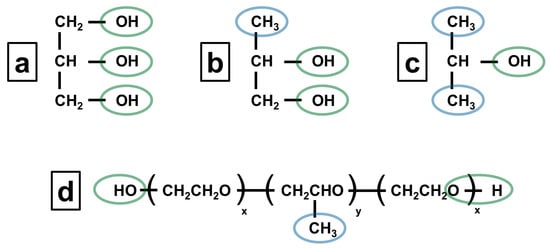 Chemical structure of (a) glycerol, (b) propylene glycol, (c) isopropanol, and (d) poloxamer.