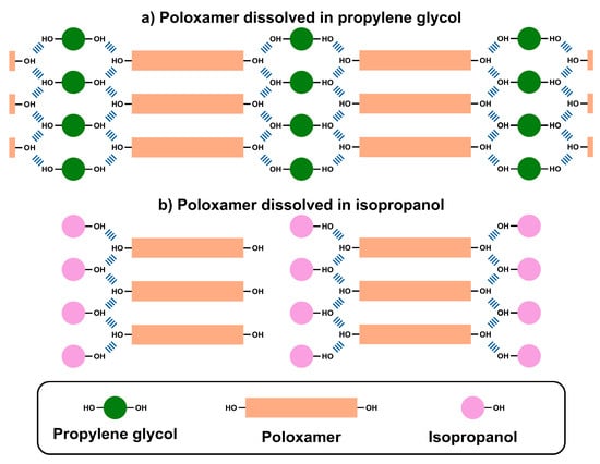 Upon heating, both isopropanol and propylene glycol dissolve poloxamer 407 through favorable molecular interactions. At elevated temperatures, poloxamer chains adopt micellar structures with hydrophobic polypropylene oxide cores surrounded by hydrophilic polyethylene oxide shells [,]. This allows dissolution of poloxamer in both solvents through miscibility between the hydrophilic hydroxyl groups of both agents.