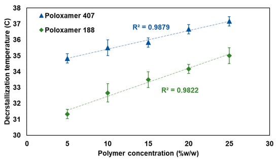 The decrystallization temperature was performed to determine the temperature at which the decrystallizing formulation switches its physical state from solid to liquid. Figure 5 presents the relationship between polymer concentration and the decrystallization temperature for both poloxamer 407 and poloxamer 188-based formulations. The results demonstrated a clear concentration-dependent increment in decrystallization temperature for both types of polymers used. For poloxamer 407, the solid-to-liquid transition temperature ranged from 35.17 ± 0.29 °C at a 5% w/w concentration to 37.33 ± 0.29 °C at a 25% w/w concentration, exhibiting an excellent linear correlation (R2 = 0.9660). Similarly, poloxamer 188 exhibited transition temperatures ranging from 31.33 ± 0.29 °C at a 5% w/w concentration to 35.00 ± 0.50 °C at a 25% w/w concentration, with a good linear relationship (R2 = 0.9822).