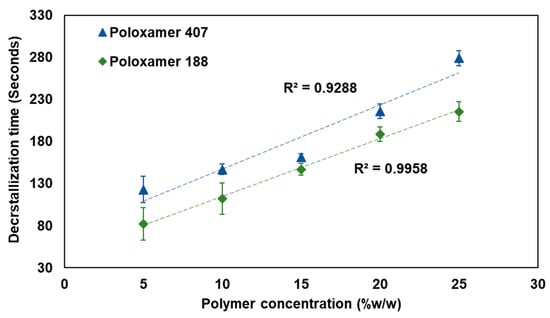 The decrystallization time was conducted to determine the duration required for the complete phase transition of the decrystallizing formulation from a solid to a liquid state at physiological conditions. Figure 6 illustrates the relationship between polymer concentration and decrystallization time for both poloxamer 407 and poloxamer 188-based formulations. The data obtained showed a direct concentration-dependent increase in decrystallization time for both polymer types. For poloxamer 407, linear correlation (R2 = 0.9288) was observed in the measured decrystallization time, ranging from 123 ± 15.59 to 279 ± 9.16 s, when polymer concentration increased from 5 to 25% w/w, respectively. Similarly, poloxamer 188-based formulations exhibited strong linearity (R2 = 0.9958) in measured decrystallization times, ranging from 82 ± 19.47 to 215.67 ± 11.59 s, as the polymer concentration increased from 5 to 25% w/w, respectively.