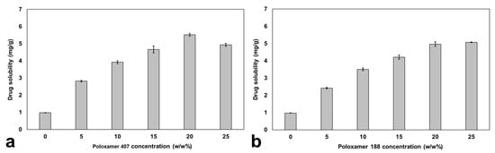 Solubility of candesartan cilexetil in propylene glycol containing (a) poloxamer 407 and (b) poloxamer 188 at various concentrations.