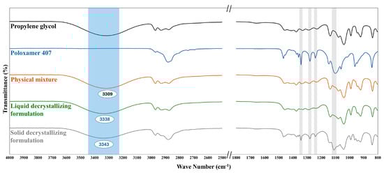 FTIR spectrum of propylene glycol, Poloxamer 407, their physical mixture, liquid decrystallizing formulation, and solid decrystallizing formulation.
