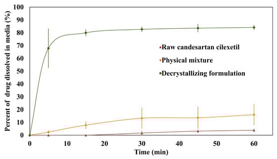 In vitro dissolution profile of raw candesartan cilexetil, physical mixture, and decrystallizing formulation.