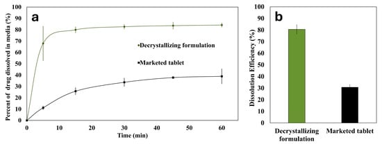 (a) In vitro dissolution profile and (b) dissolution efficiency of the decrystallizing formulation and the marketed tablet.