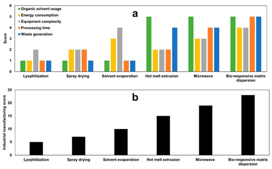 Lyophilization technology demonstrated poor manufacturing feasibility with the lowest industrial manufacturing score of 5 points. This is attributed to the use of organic solvents, which necessitate an energy-consuming sublimation process using an expensive instrument with a vacuum-controlled system [,]. In addition, the associated costs for collecting waste organic solvents during the sublimation process and disposal requirements increase the manufacturing expenses []. Moreover, the long processing times (24–72 h) further limit its applicability for mass production with low production cost [].