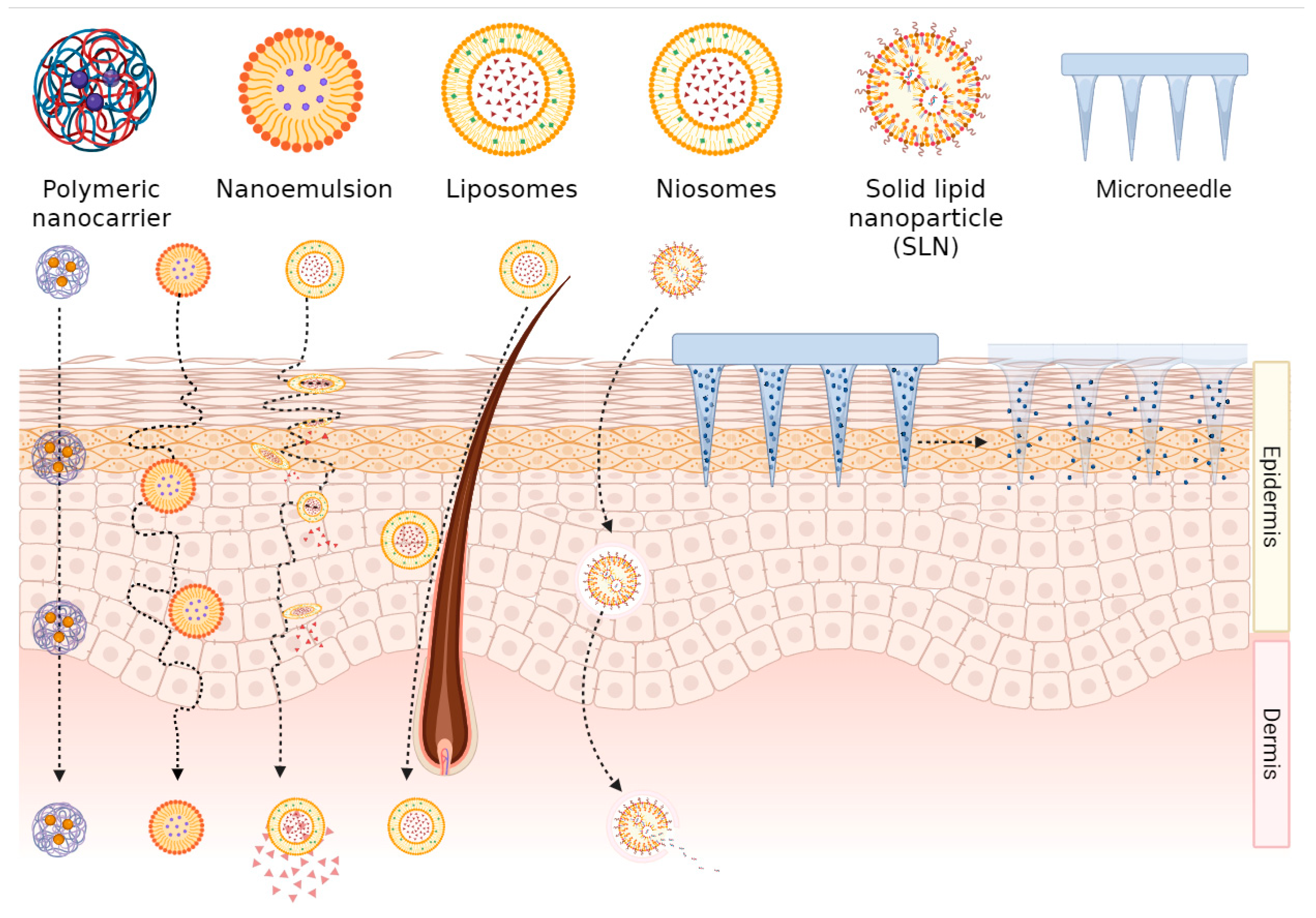 Nanotechnology is often defined as the ability to produce and process materials at the nanoscale or to manipulate nano-objects. The nanoscale is often specified as 1 to 100 nm in the field of physics because the electromagnetic and quantum characteristics of nano-objects are more prominent in this scale [10]. Based on the special properties of nano-objects, nanotechnology has been used in various fields of science, and one important application area is nanodrug carriers. Nanodrug carriers include liposomes, transfersomes, ethosomes, and nanoemulsions in which drugs can be encapsulated by dissolution, dispersion, encapsulation, adsorption, and coupling [11]. In the context of transdermal drug delivery, nanodrug carriers offer innovative solutions to overcome the skin’s natural barrier, the stratum corneum, which is a major obstacle to preventing drug penetration. The ex vivo and in vivo behaviors of drugs are determined by the physicochemical properties of the nano carriers, which can be used to enhance drug efficacy, reduce side effects, enhance therapeutic index, and improve drug compliance.