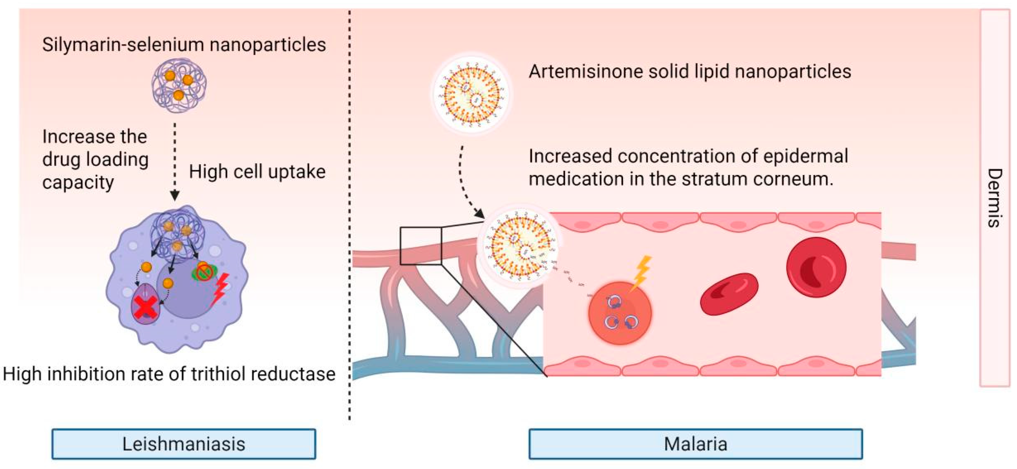 The deep integration of these mechanisms and advantages marks the transition of nanocarrier-based transdermal delivery systems into a new era of precision and long-acting performance in antiparasitic therapy. Currently, this technology has displayed significant clinical value in zoonotic parasitic diseases such as leishmaniasis and malaria. Its specific applications and future challenges will be systematically discussed below.