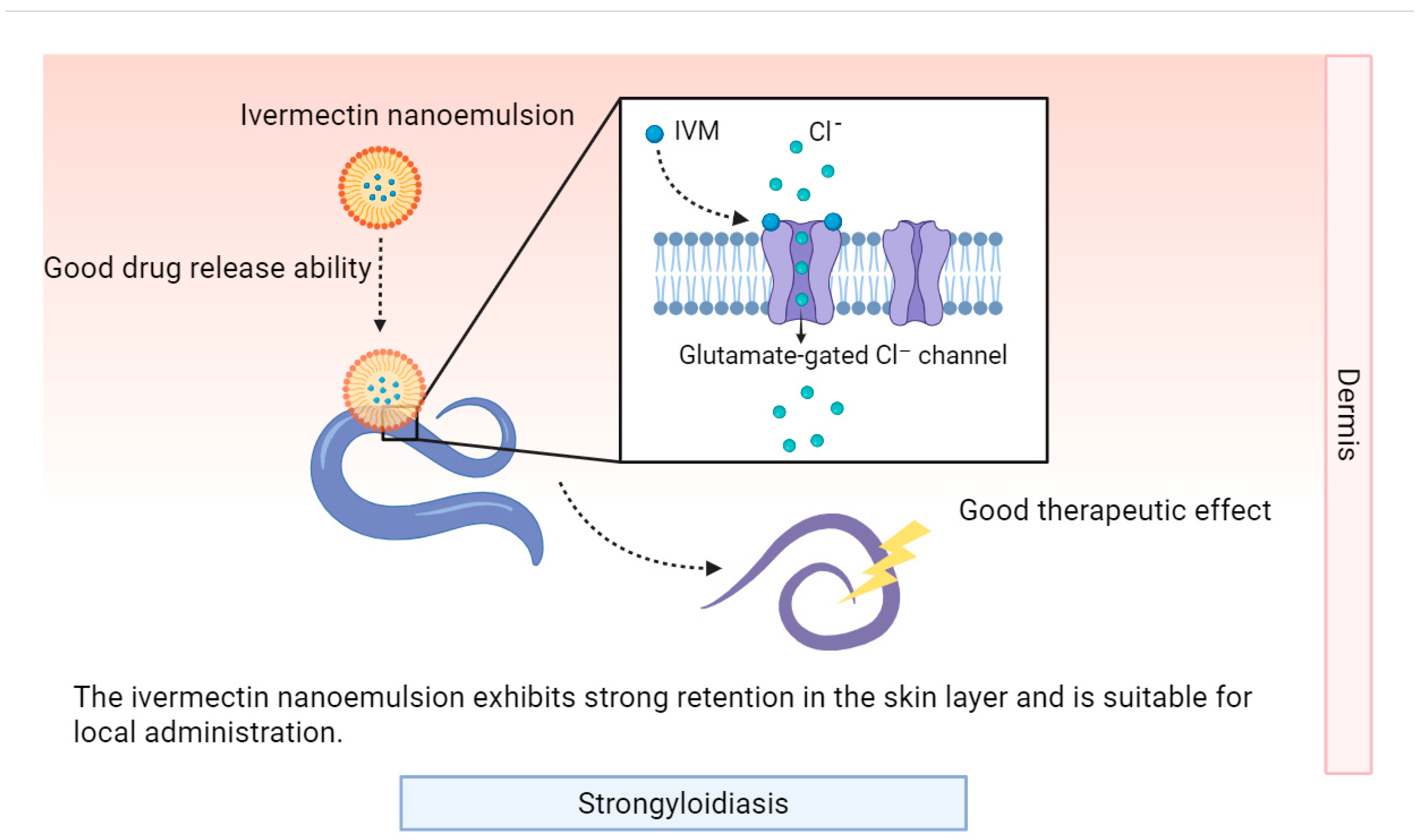 This figure illustrates the mechanism of ivermectin nanoemulsion (IVM-NE) in treating strongyloidiasis. IVM-NE, with favorable drug-release ability, releases ivermectin (IVM). IVM acts on glutamate-gated Cl channels of Strongyloides organisms. It shows strong dermal retention, good safety, and is suitable for topical administration to combat strongyloidiasis.