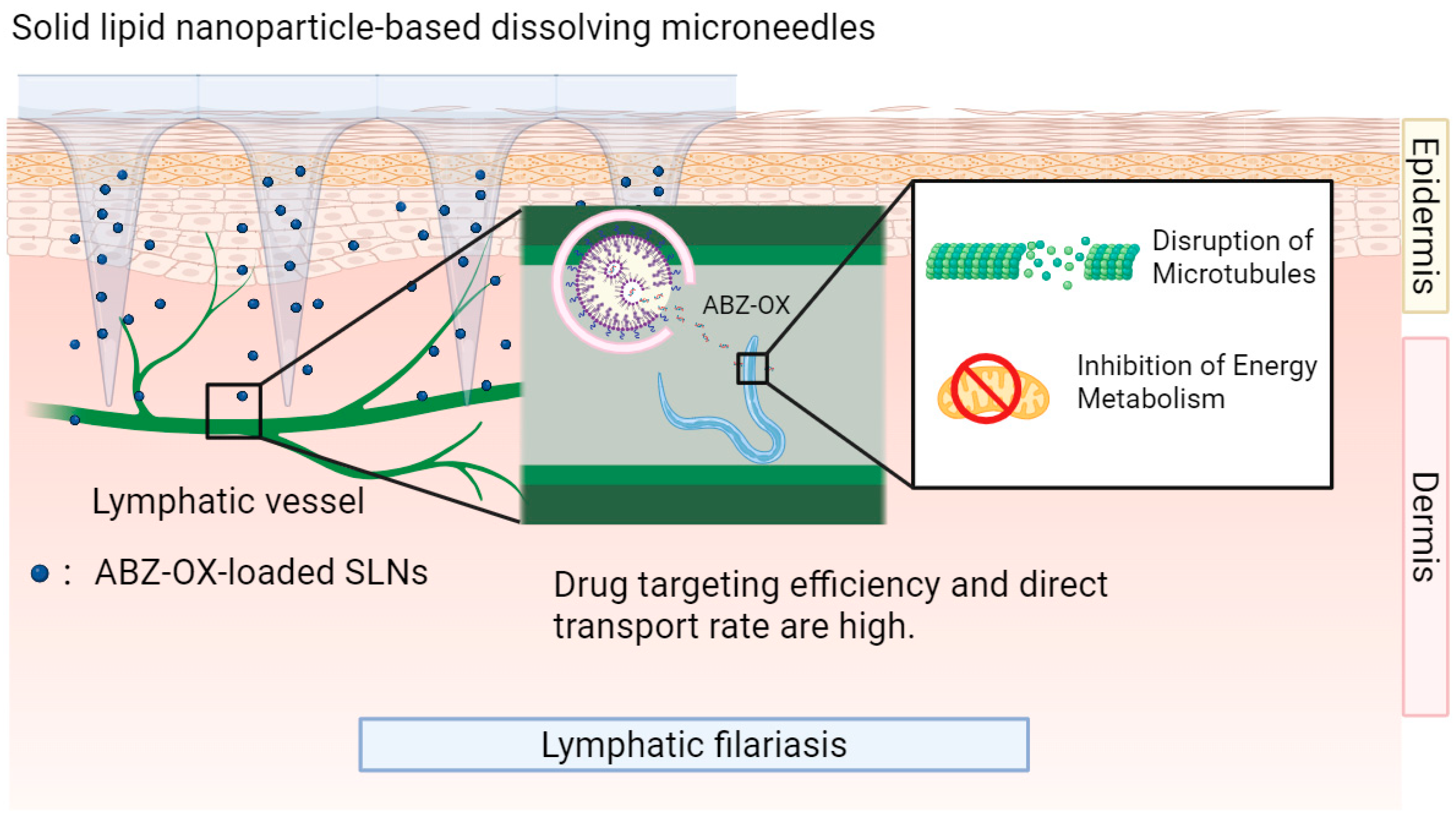 Lymphatic filariasisSolid lipid nanoparticle—microneedle systemAlbendazoleHigh drug targeting efficiency, high direct transport rate, Sustained release, reduced metabolite generation, low drug distribution in liver and kidneyIn vitro and in vivo (female Sprague–Dawley rats)PS: 95.25 ± 9.26 nm;