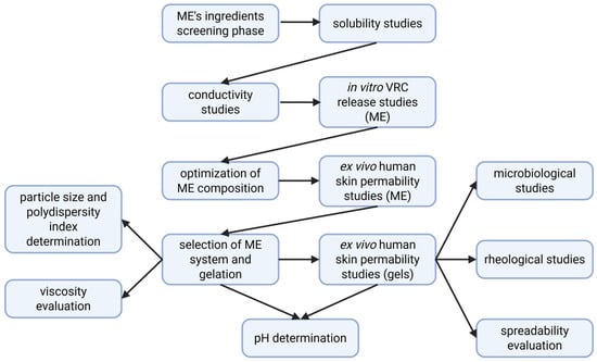 Figure 1 presents the experimental workflow for the development, optimization, and evaluation of VRC-loaded MEs and their gelled forms, including formulation screening, physicochemical characterization, in vitro release, ex vivo skin permeability, and microbiological and rheological assessments.