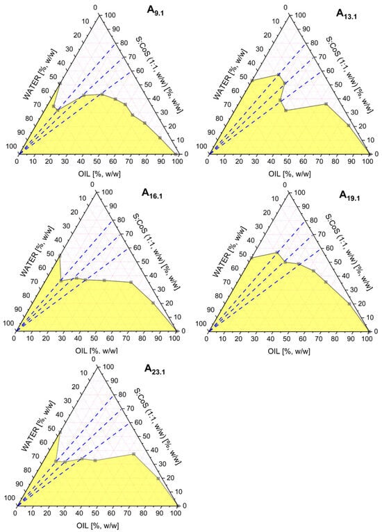 Pseudoternary phase diagrams obtained for the MEs A9.1, A13.1, A16.1, A19.1, and A23.1, differing in the type of oil phase used (triacetin, isopropyl palmitate, ethyl oleate, oleic acid, and isopropyl myristate, respectively). All systems contained a fixed surfactant-to-co-surfactant mixture (Brij® O5-SS-(RB)/Transcutol®, 1:1 w/w). The white region represents the ME area, while the yellow region corresponds to multiphase or turbid systems. The blue dashed line indicates the dilution pathway used in the conductivity study.