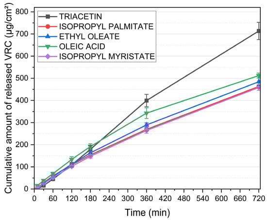 The formulation containing triacetin demonstrated the highest drug release, reaching over 713 ± 39 µg/cm2 within 720 min. This was markedly higher than the release achieved by systems based on other oils. MEs incorporating oleic acid and ethyl oleate exhibited intermediate release rates, while the lowest cumulative amounts of VRC were released from formulations with isopropyl palmitate and isopropyl myristate.