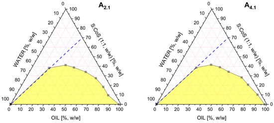 Pseudoternary phase diagrams obtained for the microemulsions A2.1 and A4.1. differing in the type of surfactant used. All systems contained a fixed surfactant-to-co-surfactant mixture (1:1 w/w). The white region represents the microemulsion area, while the yellow region corresponds to multiphase or turbid systems. The blue dashed line indicates the dilution pathway used in the conductivity study.