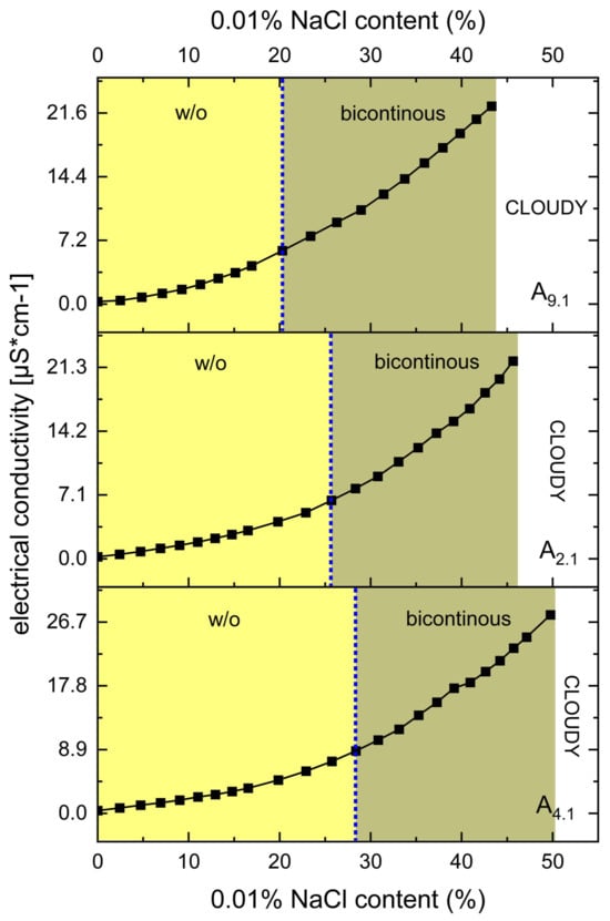 The results, presented in Figure 5, clearly indicate that none of the systems (A9.1, A2.1, and A4.1) undergo a transition from the bicontinuous structure to an o/w ME. This is evidenced by the continuous and gradual increase in electrical conductivity with increasing water content, without a sharp inflection point that would typically signify a structural transition to an o/w system.