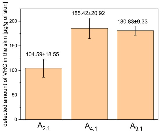 Ex vivo skin permeation and deposition studies of VRC were conducted for selected MEs (A2.1, A4.1, and A9.1), differing in surfactant composition, and ME-based polymer hydrogels (B2 and B3). All formulations were prepared at an oil–surfactant/co-surfactant (1:1 w/w) ratio of 3:7, with a fixed water content of 38% (w/w). Permeation experiments were performed using Franz diffusion cells (Teledyne Hanson Research, Chatsworth, CA, USA) with an effective diffusion area of 1 cm2. The donor chamber was loaded with 0.5 g of formulation, and the receptor compartment (volume: 9.6 mL) was filled with phosphate buffer (pH 7.4) containing 10% (v/v) absolute ethanol to maintain sink conditions.