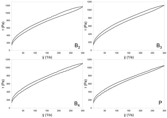 Flow behavior was assessed by plotting shear stress (τ) against shear rate (). The shear rate was increased from 0 to 300.0 s−1 and then decreased back to 0 s−1, with each ramp lasting 60 s and no pause between them. Thixotropy was quantified as the relative hysteresis area (Kd), calculated as the ratio of the hysteresis loop area to the total area under the ascending curve.